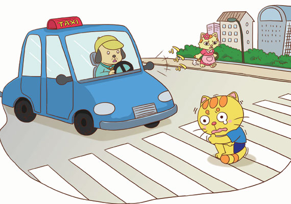 大眼猫在马路边停下了,她看着来往车辆很好玩。这时她发现了地上有一条一条白线,她想起来妈妈告诉过她这叫斑马线,过马路要走斑马线。于是她鬼使神差地穿越马路走到了斑马线上。咦?或许司机发现了她,使劲按着喇叭,大眼猫被这阵势吓破了胆,她走两步,停两步,她本想一溜烟跑过去,但腿却迈不动了。大眼猫傻愣愣地蹲在那里。被来往车辆吓傻了,司机们却放慢了速度,并给她腾出了一条道。