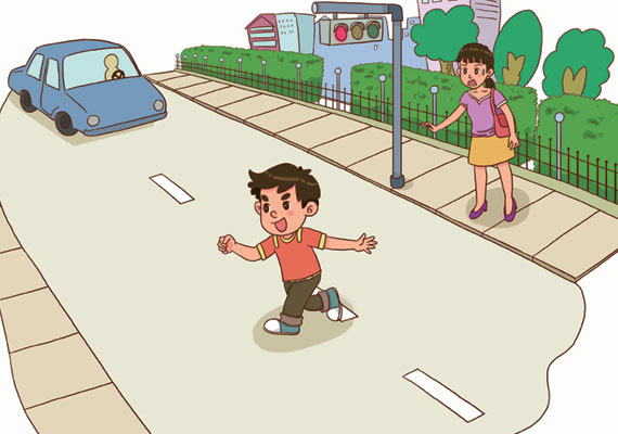 2.红灯亮时,男孩挣脱妈妈的手自己往马路对面跑。