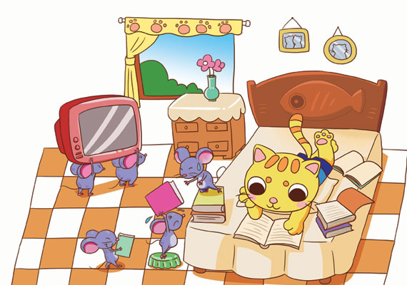 妈妈走了,大眼猫果然每天捉老鼠,老鼠吓得都不敢出来了,老鼠大王急了,让它的丞相想办法。丞相说:“猫啊,最重要的就是眼睛,如果它的眼睛坏了,那我们不就可以出去偷东西了吗?”于是,老鼠大王派人给大眼猫送去好多书和一台大彩电。大眼猫很高兴,于是天天躺在床上看故事书,还每天晚上看电视。