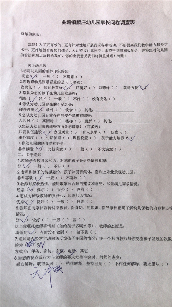 曲塘镇顾庄幼儿园家长问卷调查表及满意度