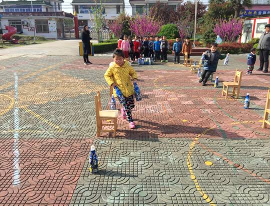 “请小朋友自觉排好队!”一听我发令,孩子们迅速站队、排齐队伍。眼睛盯着我的下一步动作。我迅速将几个罐子按一定距离摆放两条直线,并在其罐子中间加上小椅子,增加其难度。待我摆放完毕后,孩子们踊跃欲试。