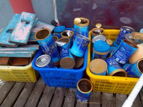教师B:我们把饮料罐放置在美工区内。孩子们会利用其它一些材料对瓶子进行装饰,如在瓶子上画画,用绳子缠绕,剪图案粘贴,这时候的瓶子作用只是美工区的一个呈现孩子作品的道具。