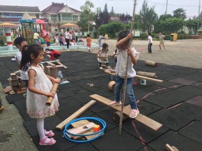 教师C:我们把小木块放在建构区里,孩子们常常是一人来拿很多块,手里拿的,胳膊夹的,然后各找一个空的区域玩。有一次两个孩子一起合作打起了麻将,玩得很顺溜。大树桩在户外游戏时孩子们最喜欢,当小凳子的,走小路的,攀爬的,就是担心有点重,孩子们搬运不方便。