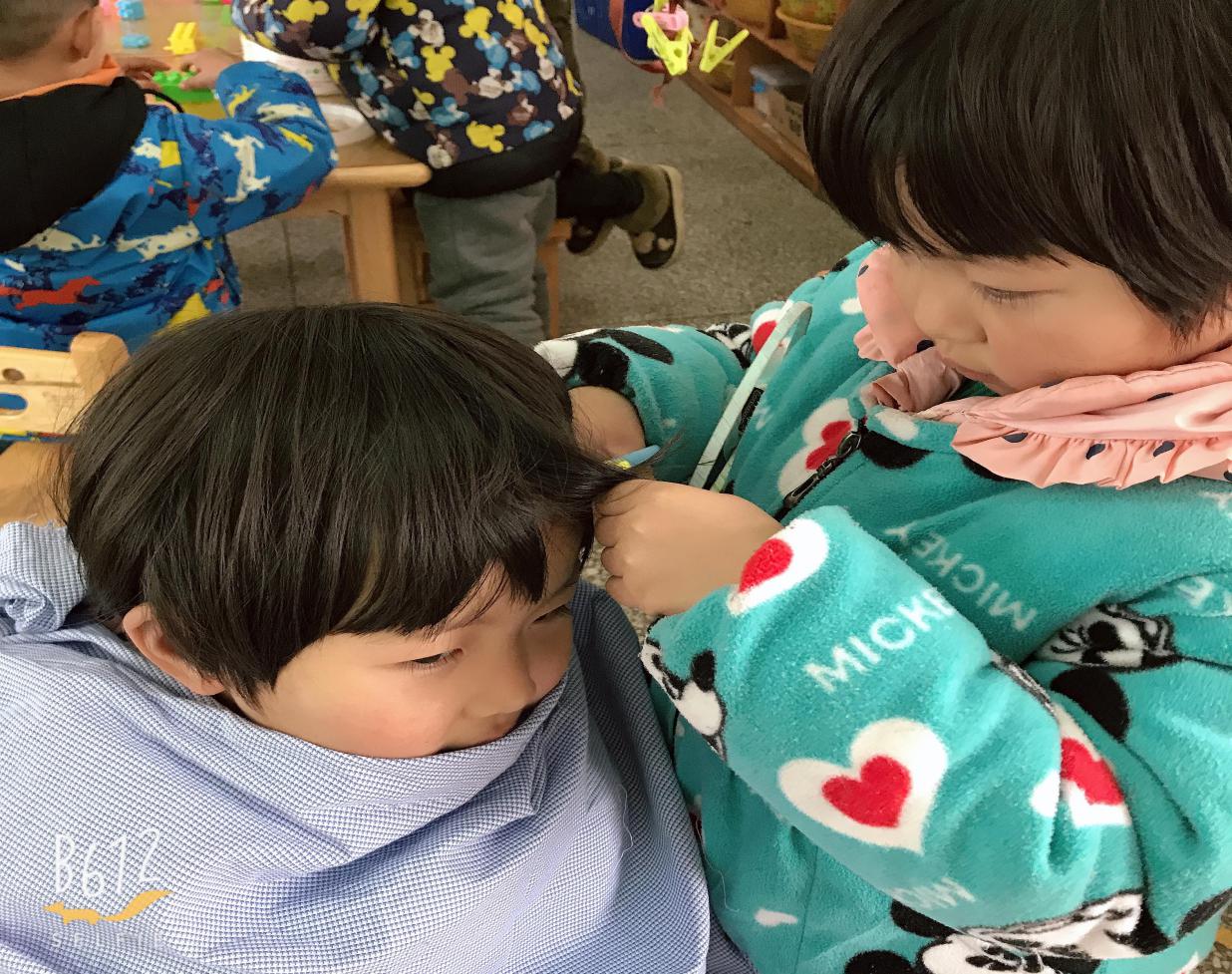 孩子们在活动中明确自己要做什么,如:要帮娃娃剪一个好看的头发、给顾客编辫子等等,能够通过自己的观察发现牙剪、推刀等常见理发工具的使用方法,而且当同伴有困惑的时候,他们还能将自己的发现告诉同伴,这种自己探索以及相互帮助的学习方式是这个活动的亮点,也是我们希望看到的东西。但是,孩子们这次的活动仅仅停留在单纯的操作理发工具中,只是将头发剪短、推短,或者进行进行简单编辫子后就将发卡堆夹在头上等等,而没有考虑到要“如何才能剪出或者装饰出好看的发型”或许,“设计发型”这个要求对他们来说有一定的难度。