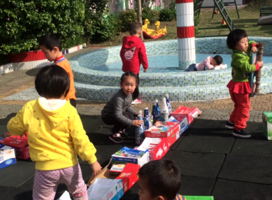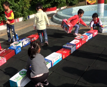 教师A:我们把这些材料放置在走廊里。在区域游戏时,有一些孩子一开始会在这个区角里玩,他们往往是用纸盒、纸筒一层一层垒高,当垒到一定高度没有平衡时就哗啦全倒下了,或是几个孩子合作玩城堡,也是一层一层搭建,一不小心哗,倒了。