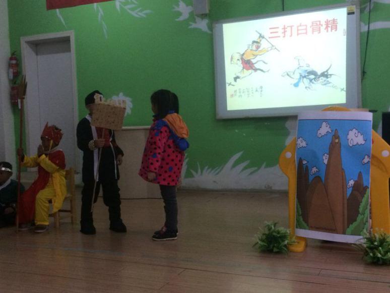 2.在关注到孩子们经验的有限之后,我召开了一次家长动员会,给家长介绍了孩子现在关于《西游记》的关注以及知识储备情况。鼓励家长充分利用亲子时间共同阅读书目,观看动画。帮助幼儿了解《三打白骨精》的大体情节,唐僧师徒分别遇到了妖精变身的小姑娘、老奶奶和老爷爷等三个小部分。