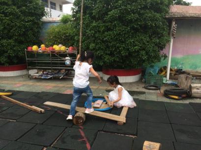 教师B:女孩A用一根圆的树桩平躺在地上,又搬来了一根比较长的窄木板放在木桩上。一个看似翘翘板的玩具做成功了。女孩A又拿来了一根竹竿做支撑,女孩A站到木板上,看似撑船一样。女孩B在圈里玩着三块木板,看到A,B站了起来,和女孩A在交流什么。