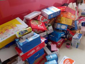 老师们以图片展示的形式向大家介绍各班收集的一些材料。图片:纸箱类(牛奶箱、衬衫盒子等) 瓶盖类 饮料罐类 纸筒类 木头类(树桩、木块等)