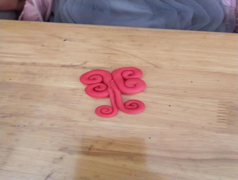 今天上的美术活动《美丽的蝴蝶》,孩子们欣赏蝴蝶的美丽,用小手捏、搓、压美丽的蝴蝶。优优捏了一只漂亮的蝴蝶,连忙喊老师看。“老师,你看这是我捏的蝴蝶。”“不错哦,很漂亮。”优优听到老师的表扬开心的笑了。
