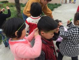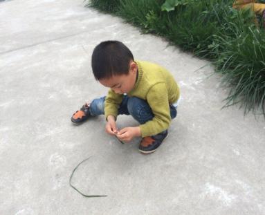在幼儿园西围墙边有一簇簇我们种植的草坪,可能是上次修剪的时候忘了,这一块草坪长得都快齐孩子们的腰了。孩子们自由活动时有几个男孩子跑进了草坪里,开始折了草枝。草枝可以干什么呢?我们做个花环戴头上吧。男A自己把草枝往头上绑,没有成功。把草枝一层一层剥开,看看到底是用外面长长的叶子还是里面有杆地可以做呢?有的在比草枝的长短,有的跑去请老师帮忙了。老师说:要把这个结打紧了就行了,你们试试看!怎样才能给自己打好这个结呢?孩子们开始互相找好朋友帮忙。