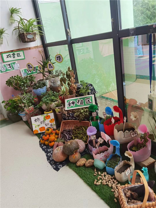 大班的自然角呈现的是农家小院一派丰收的景象。自然角充分利用空间及墙面,创设立体的环境,增强幼儿观察、探究自然的兴趣和持续性。幼儿在农家小院里不断地积累丰富的认知经验。