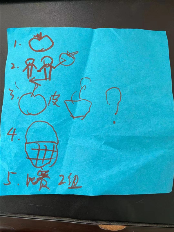 活动开始前,大班幼儿在老师的组织下开展了“我们怎么摘柿子?”的讨论活动。孩子们结合生活经验,你一言我一语,畅所欲言。摘柿子活动中的安全问题、道具问题都被孩子们在相互交流中得到解决。最后,他们用绘画的方式呈现了他们交流上午所有问题。最后,孩子们决定分组比赛采摘柿子。