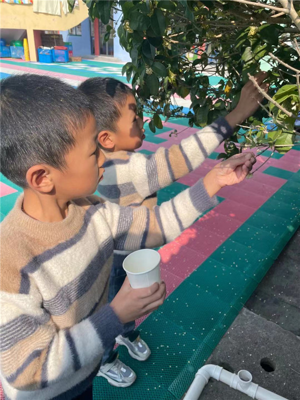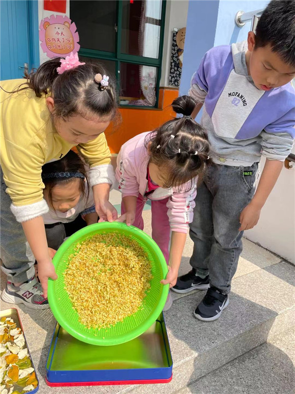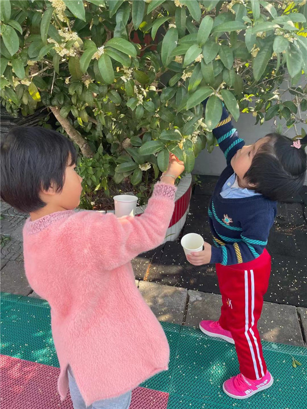 闻花香、识桂花。孩子们闻着香气寻找着幼儿园里的桂花树。老师和幼儿围绕着桂花香,在桂花树下展开讨论,一起闻花香、拾桂花、赏花瓣、识桂花,感受着秋意中的甜香。香气满园的桂花可以用来干什么?孩子们亲自动手采摘桂花、晒桂花,由此留住桂花的芬芳。