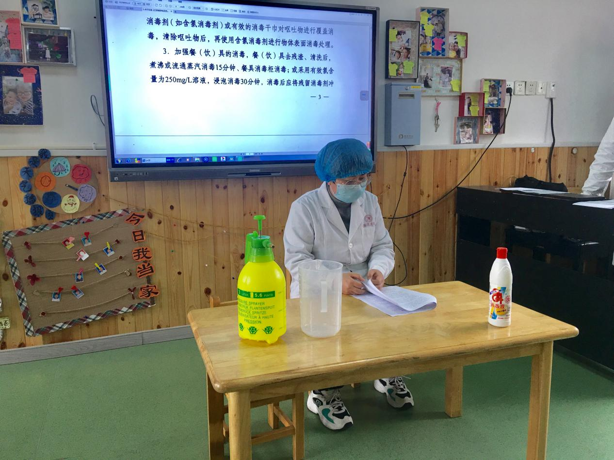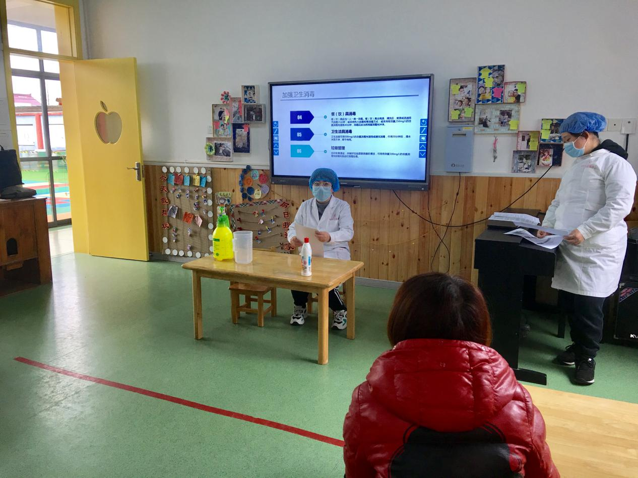 此次培训园领导高度重视,园长邀请了幼儿园驻校卫生联络员高娟医师主讲。培训内容包含个人疫情防控、食品安全、餐具消毒、84消毒液具体配比方法等。在高医师的现场指导和讲解下,食堂工作人员从开工、用工、采购、运输、加工、洗消、用餐等环节进行学习,认真倾听、记录,确保学深学精,学以致用。