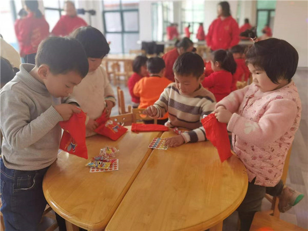 活动的最后是由园长送福袋给幼儿。印有可爱老虎图式的红色福袋里装满了园长为孩子们精心挑选的新年礼物。每一份福袋都代表着园长对孩子们浓浓的新年祝福。在孩子们的期待中,红红的新年福袋送到了他们的手中。孩子们带着无比喜悦与激动之情,打开了福袋,分享着各自获得的福袋礼物。在惊喜与美好的送福袋活动中,孩子们的幸福感由心而生。