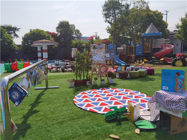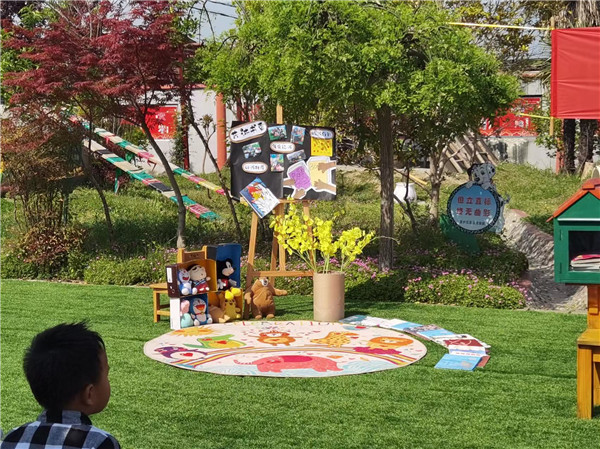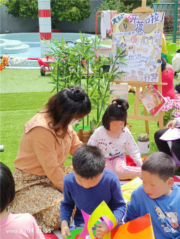 为了让大家一起在阅读中拥抱春天般的美好,幼儿园的户外绿色草坪上搭起了小舞台。全体师生共聚户外,他们精心布置着绘本故事阅读的活动现场。户外阅读场景在师幼的共同努力下搭设成型。孩子们也即将在优美、舒心的户外环境中享受书籍带来的美好。
