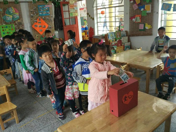 最后,幼儿园组织各班孩子开展“我为残疾孩子献爱心”捐款活动。宝贝们带来了自己的零花钱,五元、十元、二十元……无论捐款的数额是多少,心都是一样真诚,每一分钱都饱含爱的力量。