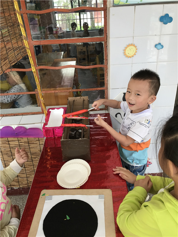 在游戏活动中,老师们注重从幼儿发展出发,充分利用室内空间进行区域创设,把身边的废旧材料及半成品,精心设计投放不同层次的活动材料与主题活动相融合、渗透,折射出教师们的独具匠心及教育智慧。小班年级组扮演着爸爸妈妈、小医生、小厨师在娃娃家角色快活动;中班年级段的孩子正在 乡村参观 、 烧烤屋 、美食坊与同伴在友好交往;大班年级组的孩子在则在 美工区 、特色区中专注学习与探索。