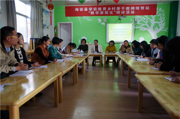 集体活动之后,培育站导师顾晓梅园长带领学员们开展了研讨活动,在研讨之中,顾园长不断地抛出问题,使老师们在讨论和思考的过程中反思教育手段和行为。针对孩子们在活动中的表现,判断教学目标是否合理,教学内容、方式及策略使用是否得当,使老师们更深刻地认识到“集体活动游戏化”对孩子们发展的重要性。